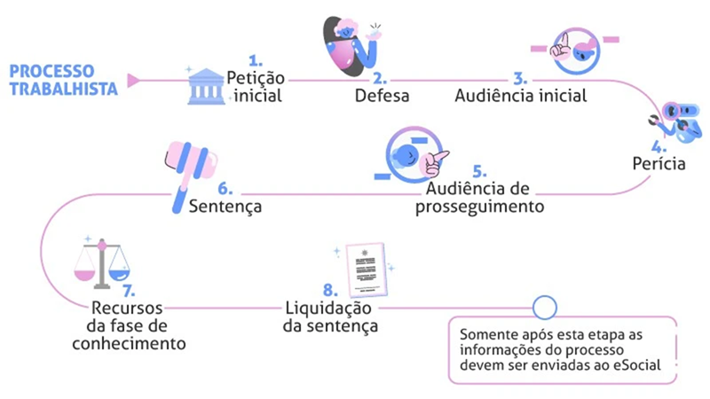 Abaixo, explicaremos as etapas de um processo trabalhista e esclarecemos como ele se relaciona com o e-Social. Em linhas gerais, uma reclamatória trabalhista é composta pelas seguintes fases: